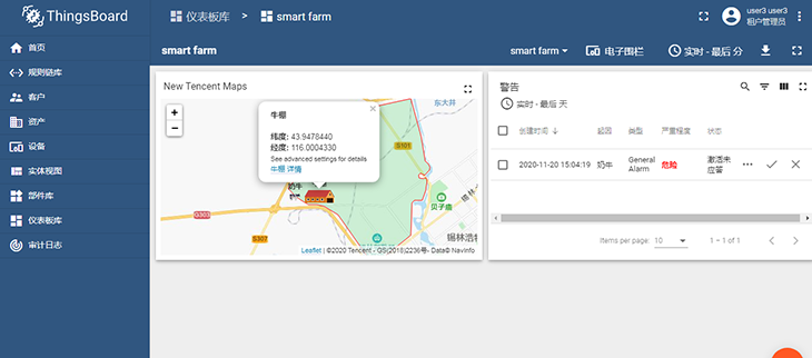 圖:智慧牧場(chǎng)課程案例,使用GPS對(duì)奶牛位置進(jìn)行定位,通過(guò)LoRa網(wǎng)絡(luò)將位置信息上報(bào),使用ThingsBoard平臺(tái)的電子圍欄工具結(jié)合騰訊地圖,實(shí)現(xiàn)奶牛越過(guò)電子圍欄時(shí)發(fā)送警報(bào)提醒。