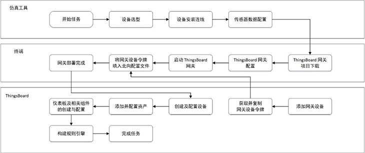 智慧溫室案例,引入了ThingsBoard IoT Gateway開(kāi)源解決方案,在AIoT平臺(tái)的仿真工具中部署ThingsBoard gateway網(wǎng)關(guān),以連接ThingsBoard云平臺(tái),便于上送溫濕度傳感器數(shù)據(jù),搭建恒溫機(jī)執(zhí)行器模塊;ThingsBoard平臺(tái),用戶可在儀表盤(pán)內(nèi)添加設(shè)置智慧溫室場(chǎng)景、溫濕度顯示設(shè)備等組件,獲取仿真實(shí)驗(yàn)中上送的虛擬數(shù)據(jù),以動(dòng)態(tài)曲線的形式作可視化呈現(xiàn);用戶還可根據(jù)案例要求,在ThingsBoard平臺(tái)的規(guī)則鏈庫(kù)中,自主編輯設(shè)定規(guī)則引擎,實(shí)現(xiàn)智慧溫室的恒溫控制與異常告警。