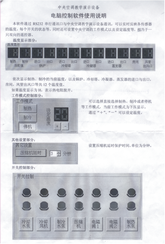 為了更好地滿足各大院校的教學需要,在原來開發的中央空調實驗設備的基礎上,配備了RS-232串行通訊接口,可直接與電腦連接,由電腦控制軟件控制整個實驗臺的運行,包括:總控臺啟動、制冷、制熱、冷卻水泵、冷卻風機、制冷水泵、壓縮機、電磁閥、制熱水泵做演示,制冷、制熱的溫度設定等。